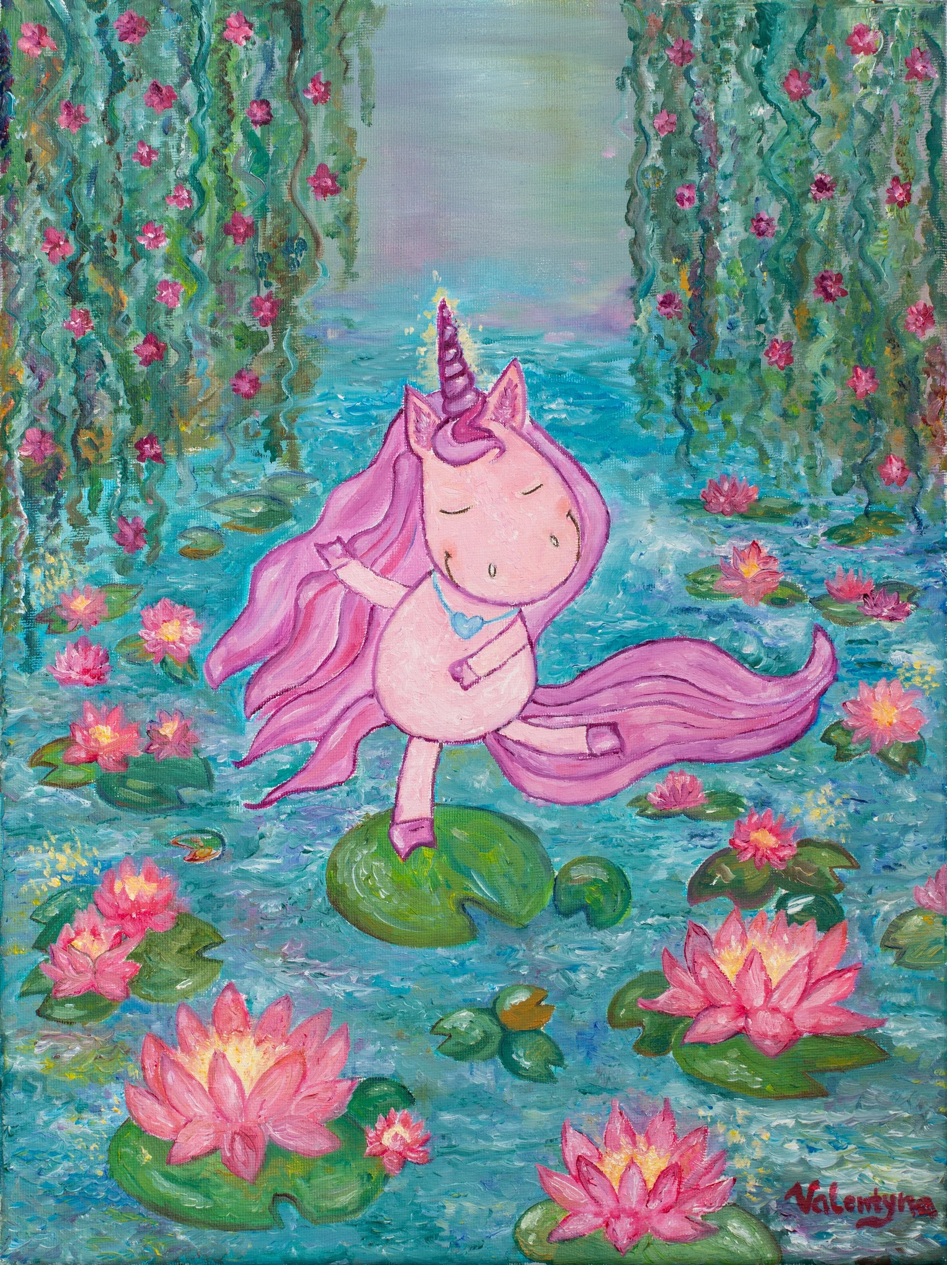 "Magie des Tanzes, unter Seerosen und das Pinke Einhorn als Blume selbst. Glücklich im Moment, geniesst die Schönheit der Bewegung und trägt etwas ganz Besonderes: das Kristallblaue Herz. Mitternacht ist die bezauberndste Zeit im Magischen Wald.